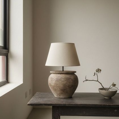 lampe de table, lampe de table rustique, lampe de table en terre cuite, lampe de table en céramique, lampe de table faite main, éclairage artisanal, éclairage intérieur, lampe décorative, lampe sculpturale, lampe texturée, lampe à patine naturelle, abat-jour en lin, éclairage rustique haut de gamme, éclairage wabi-sabi, éclairage méditerranéen, lampe portugaise faite main, éclairage fabriqué à la main, lampe au style organique contemporain.