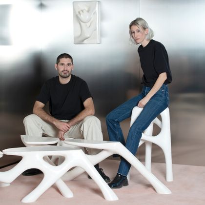 Entre minimalisme et exubérance leurs textures minérales et leurs lignes courbes dessinent un imaginaire de paysage désertique, là où le mobilier devient sculpture vivante, comme sorti de terre. La collection WHITE NOISE de Clémence Mars et Thomas Lelouch brouille les frontières entre sculpture et mobilier.
