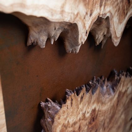 Lancée en 2023, la ligne Air’uption évoque le mouvement organique de la fusion. Chaque création fusionne des essences de bois rares à forte personnalité avec le métal oxydé, offrant une interprétation sculpturale et moderne du feu de la terre.