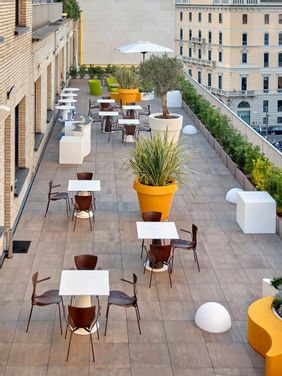 La terrasse du nouveau siège de The Fork est entièrement meublée par SLIDE; donnant sur le nouveau quartier Garibaldi de Milan.