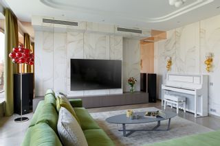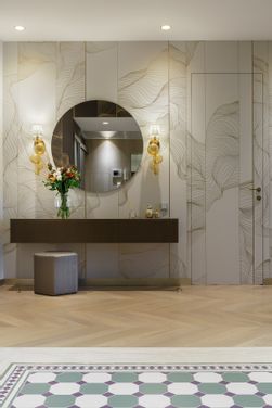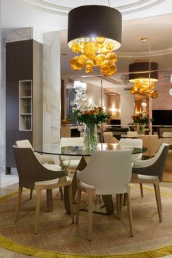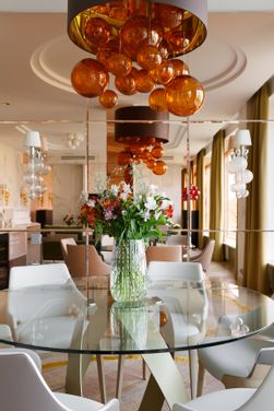 This flat is part of a complex called Novaya Zvezda and is located in a residential area of St. Petersburg in Pesochhaya Haberej Naya. The ambitious project called “La Dolce Vita” intends to renovate this flat inside this old building which is characterized by large rooms and carries the signature of one of the most renowned Russian interior designers: the architect Dmitriy Mudrogelenko of the (DZ)M Design studio. The environment presents a minimal and precious style with wallpapers that reflect the shapes present in nature and the mirrors that make the spaces even wider. The furnishings are strictly Made in Italy, finely produced and in the shades of gold, white, cream and moka. This harmony of colors is also reflected in the choice of the Murano glass chandelier above the kitchen table and the wall lamps. The Absolute chandelier used for this project is in amber glass and gathers a series of ancient artisan blown glass works: pulegoso, rigadin and balloton. Fine workmanship that creates a play of light and a relaxing atmosphere. The reflections and asymmetries characterise also the Planet wall lamp in clear glass and white organza lampshade. The artistic wall lamp Planet, has been chosen also for the entrance and has been positioned next to a round-shaped mirror, but this time the color is amber which immediately warms up the refined and delicate tones of this space. The living area has large windows overlooking the park. There is a continuity between outer and inner spaces; a sense of tranquility and well-being invades the room thanks to the moss-green sofa and the choice of accessories in different shades of gray. In addition to the Planet amber wall lamp, a touch of color and a certain movement is given by the Atmosfera luxury floor lamp of the collezione Progressive collection characterised by handblown, hand-shaped glass spheres, realised using the filigrana technique, with silver leaf and 'murrine'. The same lamp is present on the ceiling, but in the white color version. The luxury, classic style, 6 lights Tresor chandelier and wall lamps belonging to the collection Timeless embellish the bedroom characterized by custom-made furniture. The smooth, smoky-colored hand-blown glass is embellished with large Swarovski crystal elements that, together with the polished metal structure, create a refined visual game and a lively game of transparencies, colors and luminous refractions. The wide range of luxury chandeliers in blown Murano glass produced by MULTIFORME® is able to satisfy the most demanding customers and the most attentive designers such as (DZ)M Design and enhance any environment by creating the right atmosphere.