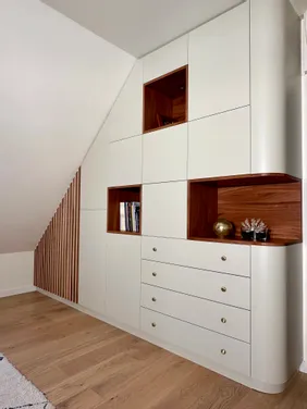 Dans cette chambre, l’objectif était de maximiser les possibilités de rangement tout en intégrant de petits espaces ouverts destinés à exposer quelques objets décoratifs. L’aménagement a été pensé pour rester léger visuellement, sans alourdir la pièce. Nous avons opté pour une couleur douce et apaisante, afin de préserver l’atmosphère reposante de la chambre. Cette teinte discrète permet au meuble de s’intégrer naturellement dans l’espace, sans attirer excessivement l’attention. Pour renforcer cette impression de douceur, un arrondi a été intégré dans le passage de porte. Cette courbe adoucit les lignes de la structure, crée une transition plus fluide entre les zones de la pièce et contribue à une ambiance générale plus harmonieuse et accueillante. Couleur Shaded White - Farrow and Ball