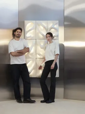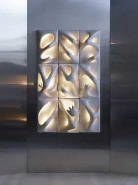 ensemble mural composé de 9 appliques de la collection White Noise. Chaque applique est indépendante mais elles peuvent s'assembler pour créer ce mural de 1,5x0,9m et proposer ainsi d'infinies compositions organiques.