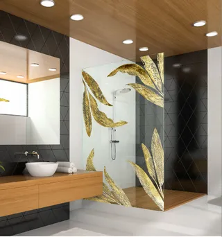 Bien souvent transparente voire quasi invisible la paroi de douche sublimée transforme la salle de bains en un espace de raffinement absolu. Feuilles d'or. design sur mesure. OrSigné™ By Amandine MANGENOT