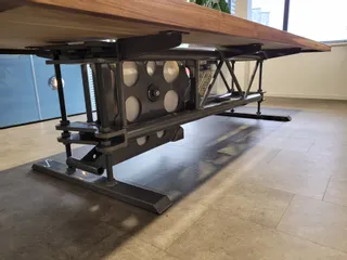 Pour le nouveau bureau de Spuiterij en Straalbedrijf Gouweleeuw BV à Emmeloord, il y avait une demande claire : une table qui reflète véritablement l’identité de l’entreprise. Micha Gouweleeuw, directeur de la société spécialisée dans le sablage et la peinture de gros équipements tels que les grues, les excavatrices et les camions, explique : « Nous travaillons avec des machines lourdes tous les jours, donc nous voulions une table qui transmette le même sentiment de force et de durabilité. » L’équipe de Sturdy-Legs a relevé le défi. Ensemble, ils ont décidé d’utiliser un composant de grue comme base de la table. La pièce a été soigneusement adaptée pour devenir un cadre unique et fonctionnel, que l’entreprise a ensuite peint elle-même. Le plateau, fabriqué en noyer américain, comporte un insert en verre au centre, mettant en valeur la structure robuste — roue comprise. Le résultat est une table non seulement pratique, mais aussi emblématique : un matériau solide pour un environnement de machines lourdes. Micha Gouweleeuw ajoute : « Nous sommes extrêmement satisfaits du résultat final. Elle correspond parfaitement à notre entreprise et à notre façon de travailler. » Cette collaboration transforme une simple table en pièce maîtresse frappante, combinant savoir-faire, créativité et durabilité.