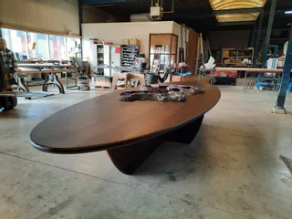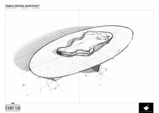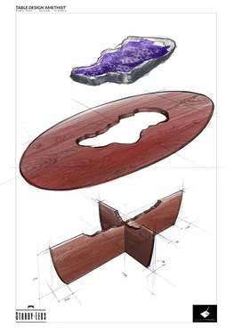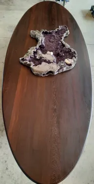 Pour la nouvelle installation de la Stone Gallery à Baarn, la mission était claire : créer une table qui mette en valeur une améthyste exceptionnelle. Roy Masin, gemmologue et propriétaire de la galerie, explique : « J’ai une magnifique améthyste et je cherchais depuis longtemps quelqu’un capable de créer une table autour d’elle. Jusqu’à présent, je n’avais trouvé personne qui le puisse ou qui le veuille. Chez Sturdy-Legs, dire non n’est pas dans notre vocabulaire. L’échelle était immense 160 x 120 cm et 400 kg mais la taille de l’améthyste ne nous a pas intimidés. Le design et le choix des matériaux avaient déjà été imaginés par Nathalie Petersen. Le bois de wengé a été choisi pour sa teinte sombre, mettant parfaitement en valeur le violet de l’améthyste et soulignant la richesse de la texture du bois. Après avoir créé les moules pour le plateau et le piètement, la table a pris vie. La pièce finale mesure un impressionnant 460 x 160 cm un véritable objet phare et centre d’attention. Cette collaboration a transformé une simple pierre précieuse en une sculpture fonctionnelle extraordinaire, alliant savoir-faire, élégance des matériaux et audace dans les proportions.