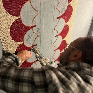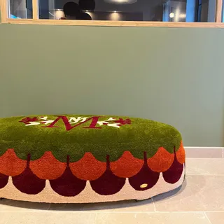 Projet Domaine Jean Marc Millot France, Bourgogne. C’est une histoire de transmission, un héritage qui vient de la terre, un blason familial que l’on arbore fièrement. La structure est un pièce vintage de Rosello Paris modifiée, pour s’adapter à l’espace. Les Initiales du Domaine fièrement placées en son centre d’assise. Le tour est inspiré d’une estampe japonaise du 15ème siècle. PIECE SUR MESURE PIECE NUMBER 64 Dimensions 149cm x 60cmX 39CM. Fibers Laine de Nouvelle Zélande.