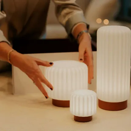 Dentelles fait référence aux napperons en papier utilisés par Lieven et Jenny Vanhalst dans la pâtisserie dans les 70's. Empilés, ils inspirent la forme signature de cette collection. Le mot contient « elles », qui fait référence à « les filles » en français. En effet, Dentelles est l'œuvre de deux jeunes femmes, Paulien et Kaat. Dentelles se distingue dans n'importe quel intérieur ou extérieur. Les lampes, ainsi que les haut-parleurs, sont sans fil et faciles à déplacer. Fabriquée à partir de matériaux recyclables et incassables, Dentelles apporte d'élégance et polyvalence à tout espace.