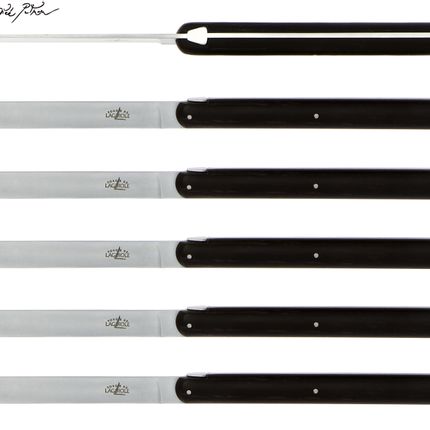 Couteaux de table de la gamme Signature dessinés par Andrée Putman. Ce modèle existe avec un manche en Ebène et une finition satinée. Cette allure fine et élégante vous assure une table simple et raffinée.Pour un usage plus intensif au quotidien, nous proposons également un modèle en frêne densifié résistant à l'eau.L'élégance en toute simplicité. Disponible en coffret de 6 ou de 2 couteaux.