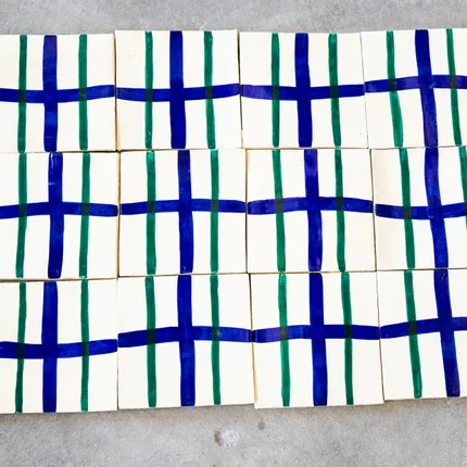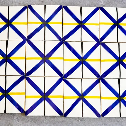 Les carreaux de 17 cm sur 17 cm ont une finition irrégulière, aussi bien en termes de surface que de forme. La peinture de Bela Silva Tavira est manuelle, chaque pièce ayant un caractère unique grâce à des coups de pinceau plus ou moins appuyés. La collection « Tavira » se compose de quatre dessins qui forment quatre motifs distincts.