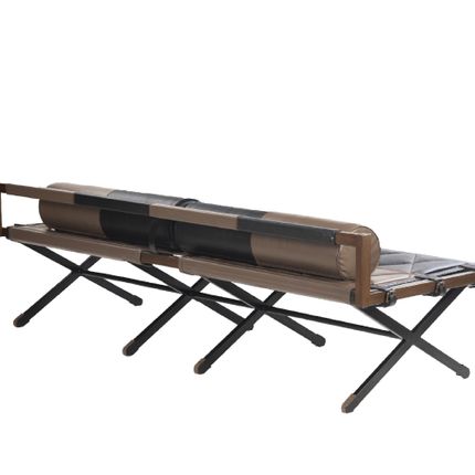 Cuir de grenache avec des notes de myrtilles, de fruits du dragon, de framboises, de mûres et des notes de laurier. Associé à une toile aux tons terreux, orné de raccords et de rivets en laiton, d'un cadre en fer noir et d'une finition en bois flotté.