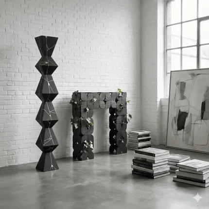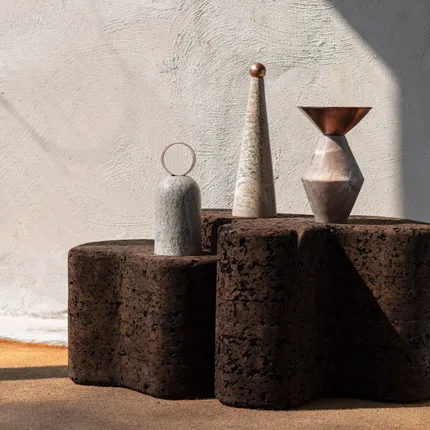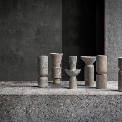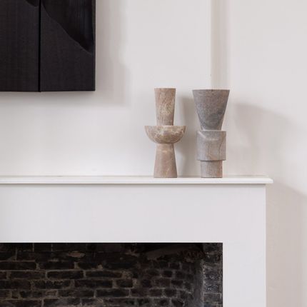 Les Totems Constantine de Tatiana Queiroz portent le nom du sculpteur roumain Constantine Brâncusi, l'un des sculpteurs les plus influents du XXe siècle. Brâncusi a sculpté l'essence des choses et donc souvent intégré la géométrie dans son art Tatiana Queiroz, intriguée et inspirée par la pionnière du modernisme, construit ses totems Constantin en fraisant la pierre à savon dans des formes géométriques. Il met l'accent sur les contours propres et ajoute du mouvement en combinant de la pierre à savon naturelle avec des ornements en acier au carbone.
