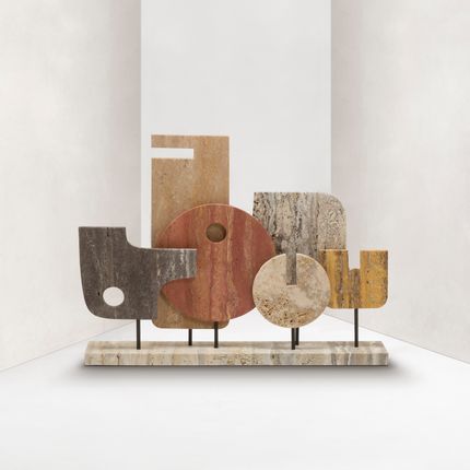 Les pièces marquantes de ces collections sont désormais déclinées dans leur version entièrement en marbre, avec une sélection de nuances élégantes. Une combinaison de design de l'époque spatiale et d'art tribal, ce totem contemporain est une grande pièce décorative capable de créer un lien entre abstraction et figuration. Cette sculpture présente des volumes de marbre colorés maintenus en suspension par des tiges de bronze brossé.