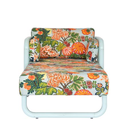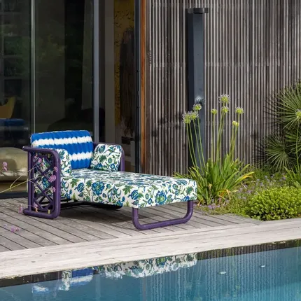 Structure en hêtre laqué Aquamarine avec panneaux décoratifs au dessin de treillage. Mobilier d'extérieur avec traitement outdoor. 1 coussin de dos et 2 coussins de côté. Hêtre français issu de forêts gérées durablement. FINITIONS personnalisables. Ebénisterie d'art depuis 1885. Fabrication française (Ain) à la demande (8-10 semaines).