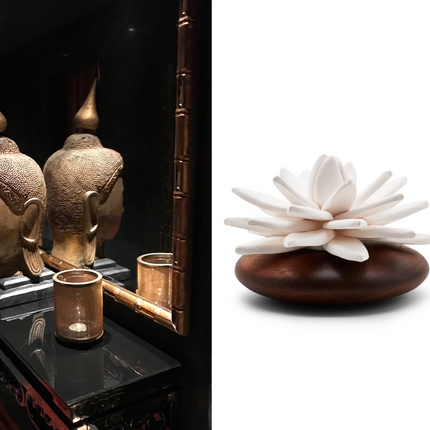 Diffuseur de parfum naturel. La base du diffuseur aromatique est faite en bois d'Acacia et la fleur de lotus est en céramique blanche. Cette pièce est artisanale et unique, entièrement réalisée à la main. Utilisation : Ajoutez 2 à 3 gouttes de parfum d'intérieur ou d'huiles essentielles sur la fleur et votre espace sera parfumé localement et durablement de la senteur de votre choix. Cette gamme compte 3 modèles différents. Découvrez nos produits coordonnés et complémentaires puis composez votre gamme : boites, diffuseurs, décoration, parfum d'intérieur, photophores.... . Diam 10cm.