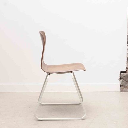 Cartel de Belleville propose la chaise Galvanitas S23 et fait revivre ce modèle vintage de collectivités hollandaises des années 60. L'assise est en Pagwood couleur chêne, contreplaqué de bois dans lequel est injectée de la résine, apportant souplesse et robustesse à l’ensemble. Le piètement en traineau est laqué et est disponible en blanc, noir ou vert, et rend la chaise empilable.