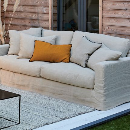 Le BRUGES de la gamme Lin, est la version profondeur 90 cm du modèle Biscarosse. Vous retrouverez le confort de la plume et la pureté du lin. Les modèles de la gamme BRUGES sont disponibles en : - 2 places : 186 cm - 3 places : 206 cm - 4 places : 240 cm - Fauteuil XL : 132 cm - Petit fauteuil : 90 cm - Pouf XL : 90x60 cm - Compositions canapé d'angle