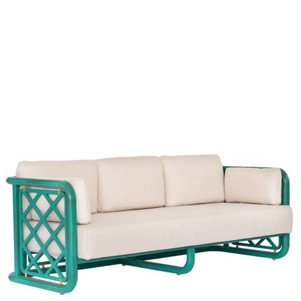 Structure en hêtre laqué Malachite, avec panneaux décoratifs au dessin de treillage. Mobilier d'extérieur, traitement outdoor. 3 coussins de dos et 2 coussins de côté. Hêtre français issu de forêts gérées durablement. FINITIONS personnalisables. Ebénisterie d'art depuis 1885. Fabrication française (Ain) à la demande (8-10 semaines).