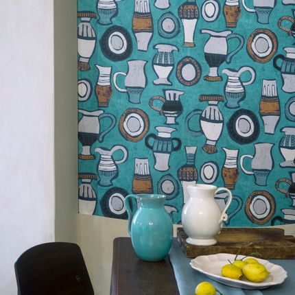 Ce motif reprend une gouache datée de 1950 et conservée dans les archives de la Maison. Présentant une collection de pots en terre émaillée, il rappelle l'enthousiasme pour les créations des artisans-potiers à cette époque. Les coloris jouent des argiles aux ocres sur un fond nacré rappelant les céramiques et leurs vernis.