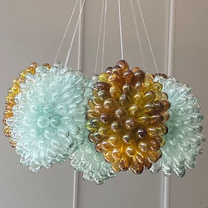 Lampe grappe, à poser ou à suspendre, en verre recyclé soufflé à la bouche. Couleurs teintées dans la masse. 5 tailles disponibles. Possibilité de choisir votre propre mélange de couleurs. Origine Syrie.