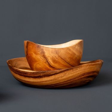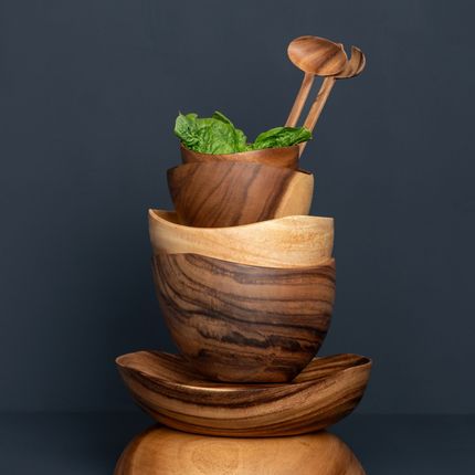 Les lignes naturelles sont caractéristiques de la collection Flow. Les bols Flare sont disponibles en version haute et basse, avec un bord irrégulier et naturel inspiré de la nature. Chaque bol est différent et présente un aspect purement naturel, car tous les produits ont été sculptés dans un seul morceau de bois d'acacia des Philippines. Les bols sont disponibles en cinq tailles : XS (15 cm de diamètre), S (19 cm), M (22 cm), L (abaissé à 25 cm), XL (abaissé à 30 cm). Tous fabriqués de manière équitable.