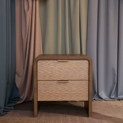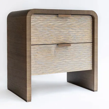 Le chevet Serenity associe un chêne brossé teinté à des façades de tiroirs en marqueterie de paille, réalisées selon le motif Volutes.Les poignées et pieds en laiton patiné brossé complètent l’ensemble avec équilibre et sobriété.Une pièce qui illustre le savoir-faire des Ateliers Lison de Caunes et la recherche d’une élégance contemporaine et maîtrisée.