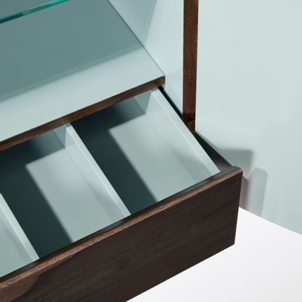 Design par Bina Baitel. Structure en Dogwood teinté, vernis satiné, intérieur en laque Bleu Orage, piètement et poignées en inox Bronze Médaille. Choisir des finitions peut faire toute la différence. Dans cet esprit, Philippe Hurel offre un large éventail de choix pour vous aider à trouver les meilleures finitions pour votre projet.