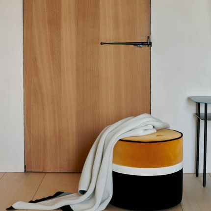 Siège d’appoint ou repose-pieds, indémodable, le pouf Léo imaginé pour le Roch Hôtel and Spa garde une base de velours noir profond, surlignée d’une bande blanche généreuse. L’assise – bordée d’un passepoil noir – se décline en 7 différentes teintes.