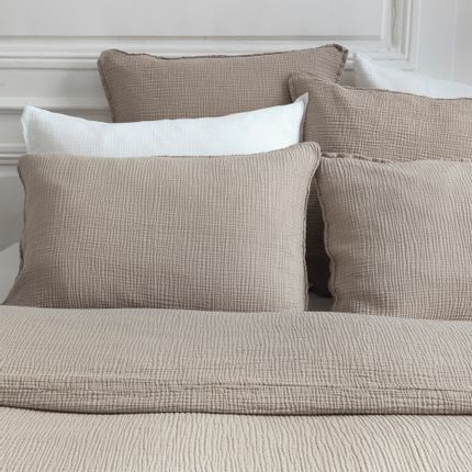 Une nouvelle matière toute douce, moelleuse à souhait pour cette housse de couette en double gaze de coton grège. Vous serez charmer par son coté gaufré qui lui donne de la la matière. Vous ne penserez plus qu'à rejoindre votre lit en bonne compagnie .Fini les corvées de repassage avec cette housse de couette en gaze de coton.