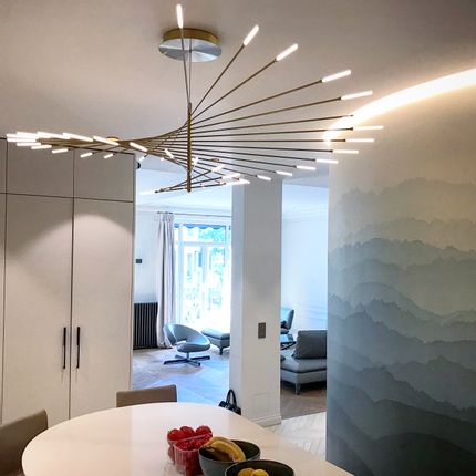 Galaxie spirale aux rayons délicats, _M101, la dernière née des créations d’Henri Bursztyn, nous transporte dans la constellation de la Grande Ourse. Suspension sculpturale et majestueuse, _M101 se déploie en un tourbillon de lumière. Spirale gracieuse aux rayons effilés, elle illumine l’espace d’une multitude d’étoiles dorées. Sa belle envergure de 2 mètres, son poids plume et sa faible hauteur permettent de l’installer sous tous les cieux !