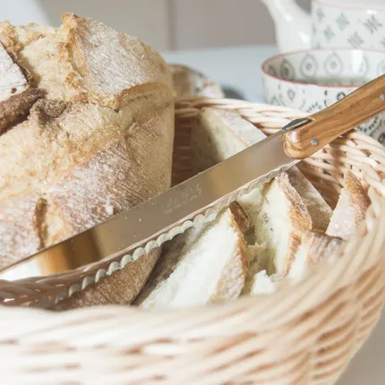 Lame en acier inoxydable trempé X46Cr13. Épaisseur 1,2 mm. Arête de coupe dentée finition miroir+couverts biseautés en acier inoxydable X6Cr17 entièrement en soie. Poignées en différents types de bois (olivier, hêtre, chêne, sapelli, padouk, wengé et chêne chauffé). Assemblage de 3 rivets. Produit 100 % fabriqué en France.