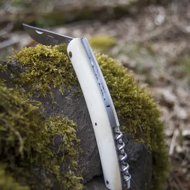 LE THIERS fermant 9 cm ou 11 cm. Avec ou sans tire-bouchon (11 cm). Lame inox Sandvik trempé. Epaisseur 2,5 mm (9 cm) et 3 mm (11 cm). Finition satinée. Manche corne ou os. Lame lisse. Guillochage main. 100% fabriqué en France.