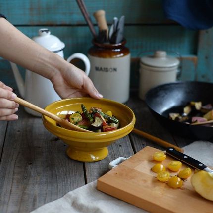 Un saladier à pieds avec un détail en forme de ceinture sur le bord et une forme légèrement incurvée. Le pied permet d'obtenir un récipient plus grand qui rythmera la table et contribuera à créer une table élégante et luxueuse. Il est également idéal comme corbeille à fruits et placé sur la table à tout moment. L'utilisation d'argile grossière blanche et de glaçure colorée donne des couleurs profondes aux variations uniques.
