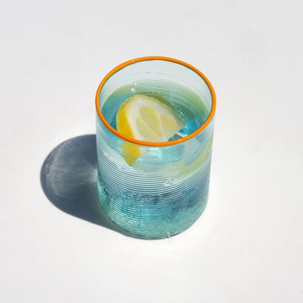 Les verres Fizzy ont la forme cylindrique classique du Goto de Murano, adoucie par la technique rigà-menà qui allège l'épaisseur du verre, joue avec différentes teintes lorsque la lumière se reflète et les rend extrêmement agréable au toucher. Le fin bord noir est scellé à chaud et agit comme contropart au rose de l'objet. L'ajout d'unicité à l'objet est le rose qu'il est l'une des options les plus précieuses du kaléidoscope chromatique du verre : la couleur est obtenue en mélangeant de la poussière d'or et de rubis et en plaçant ce mélange dans le four deux fois.