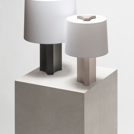 Base en bois recouvert de cuir avec abat-jour en lin fin. Inspirée des éléments architecturaux typiques de l'antiquité classique, comme les anciennes colonnes grecques, cette lampe arbore de fines courbes et de bords qui mettent en valeur des interactions accrocheuses d'ombres lorsqu'elle est éclairée. Disponible en deux tailles, cet article accueille trois ampoules E14.