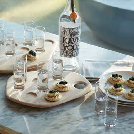Les verres à shot et les tapas reposent sur des planches de bois de forme organique conçues pour être transportées comme une palette d'artiste, pour faciliter le service. Les verres cylindriques et les bols en porcelaine sont disposés de manière à laisser de l'espace sur les planches pour servir des amuse-gueules, des olives, des trempettes et du pain avec des shots