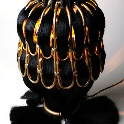 Lampe magicienne. Une structure rotin vintage rehaussée d'or et habillée d'une élégante parure de cheveux noirs.