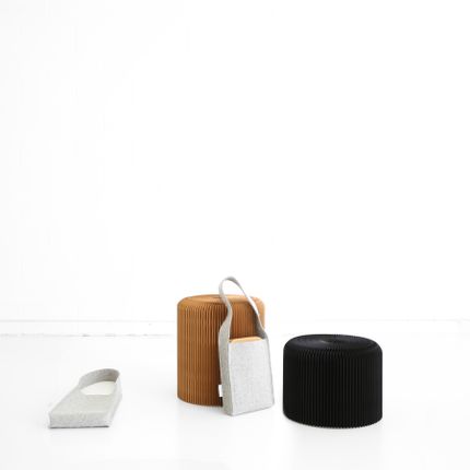 Le tabouret en papier pliable SoftSeating se range compressé comme un livre. Ce meuble en papier se déroule dans un tabouret en papier compact ou s'étire dans un long banc en papier. Structuré avec une géométrie en nid d'abeille, le siège pliable offre une résistance et une flexibilité étonnantes. Plusieurs éléments peuvent être empilés pour créer des collines ludiques ou reliés par des panneaux d'extrémité magnétiques pour former de longs bancs sinueux et des topographies de sièges créatives. Les sièges en papier sont conservés dans la collection permanente du Museum of Modern Art.