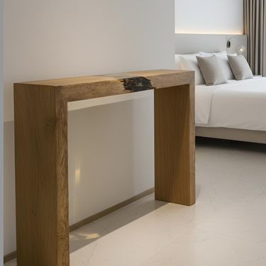 Intégrer une console dans son intérieur est l'occasion de bouleverser ses habitudes de décoration et de jouer sur la tendance du Mix and Match. Cette console est en chêne 100% massif, issu des plus beaux massifs forestiers de Franche-Comté. Son aspect brut et texturé ainsi qu'une finition vieillie lui apportent caractère et chaleur. Le plateau est déchiré sur toute la largeur, laissant ainsi entrevoir le bois défibré et noyé dans la résine transparente, un procédé unique de fabrication. Cette pièce a été entièrement fabriquée dans notre atelier dans le respect de la tradition.