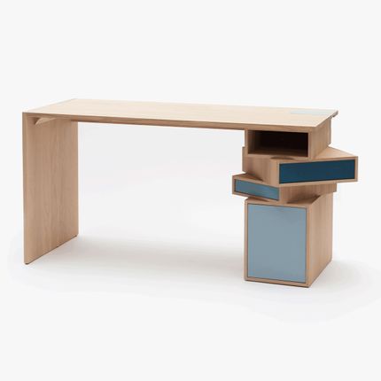 Opposition entre côté sobre et côté désordonné, le bureau EMPIL joue sur les contrastes. Composé de 3 caissons que l'on fait pivoter à sa guise, il offre les fonctionnalités d'un bureau classique. Le dessus est équipé d'une prise pour recharger son portable. 1 porte et 2 tiroirs pousse lâche - 1 tablette amovible (réglable sur 3 hauteurs) dans le caisson du bas. H.75CM X L.140CM X P.60CM - Épaisseur du plateau 22MM, poids : 39kg - Chêne 100% massif issu de forêts françaises gérées durablement - Vernis mat + couleurs personnalisables - Livré monté - Bureau fabriqué en France, Anjou