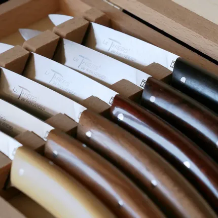 LE THIERS 21,5 cm. Lame inox X46Cr13 trempé. Epaisseur 2 mm. Pleine soie. Finition satinée. Manche buis, olivier, noyer, amourette, palissandre, ébène ou acrylique. Lame lisse. Produit 100% fabriqué en France.