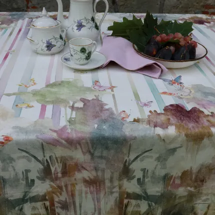 UN VOL DE PAPILLONS DANS UNE MER DE PASTEL. POUR UN DÎNER DANS LE JARDIN, POUR UNE FÊTE ENTRE AMIS POUR DÉCORER LA TABLE AVEC ÉLÉGANCE.NAPPE IMPRIMÉE EN PUR LIN 170*170 - 170*230 - 170*290