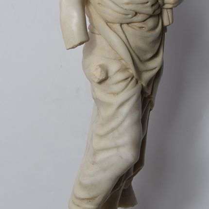 Beau torse drapé fini dans les moindres détails. Scopito en marbre de Carrare. Placé sur une base en travertin dont il est séparable. Inspiré de la statue d'Esculape ou d'Asclépios, le dieu de la médecine dans la Grèce antique. les mesures sont, y compris la base cm 66 x22x17,5 - le poids kg 23